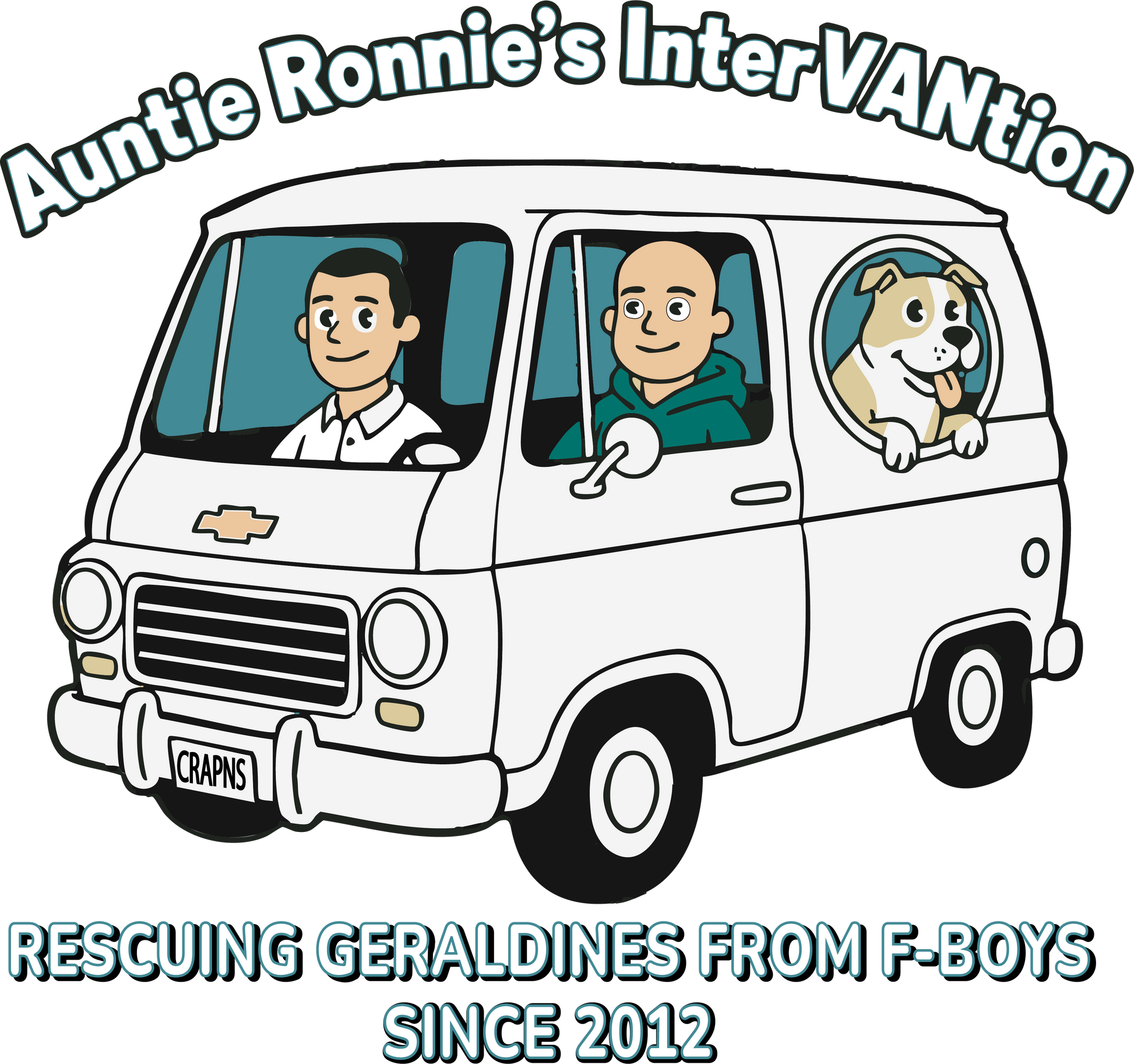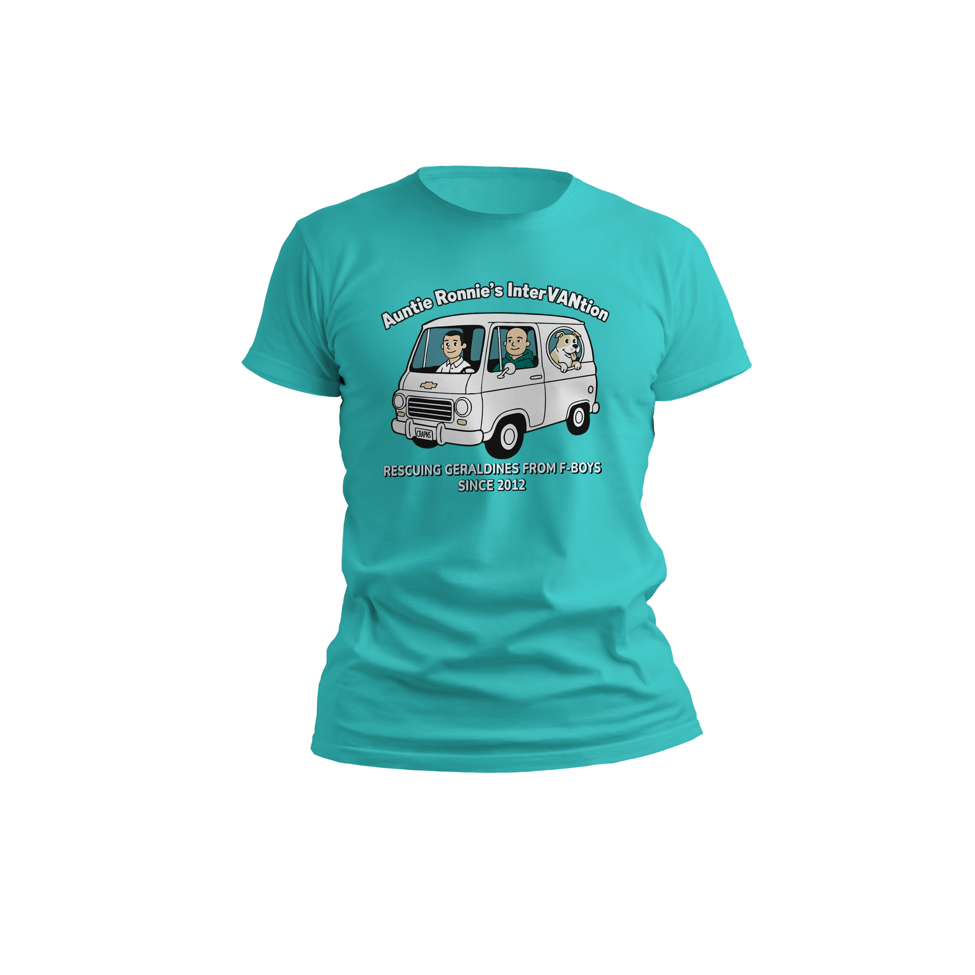 You know you want to climb in and let Auntie Ronnie, Ben & Bueller whisk you away from all those wretched F-Boys. The Comic style shirt comes in your choice of either Crappens blue or white. The back of the shirt displays Auntie Ronnie's sage advice to "Get In The Van!"