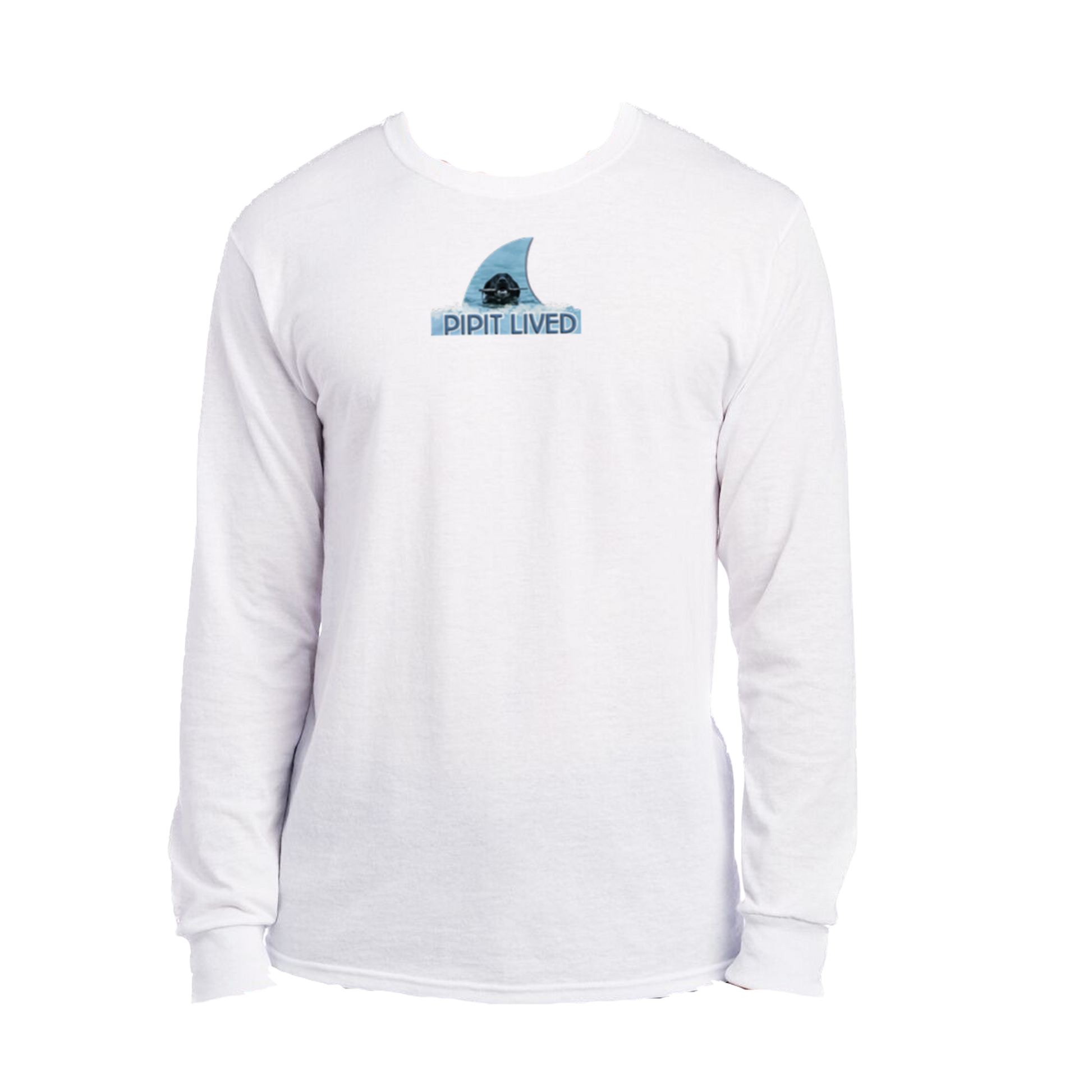 The Long-Sleeve T-Shirt is crafted from 50% preshrunk cotton and 50% polyester, it features a moisture-wicking DryBlend® fabric. Quint, here modeling the heather blue, says it's the perfect length to cover up his tattoos of traumatic memories from his time serving in the Navy. Design on back comes with red font lettering on the heather blue and white shirt and white lettering on the grey.